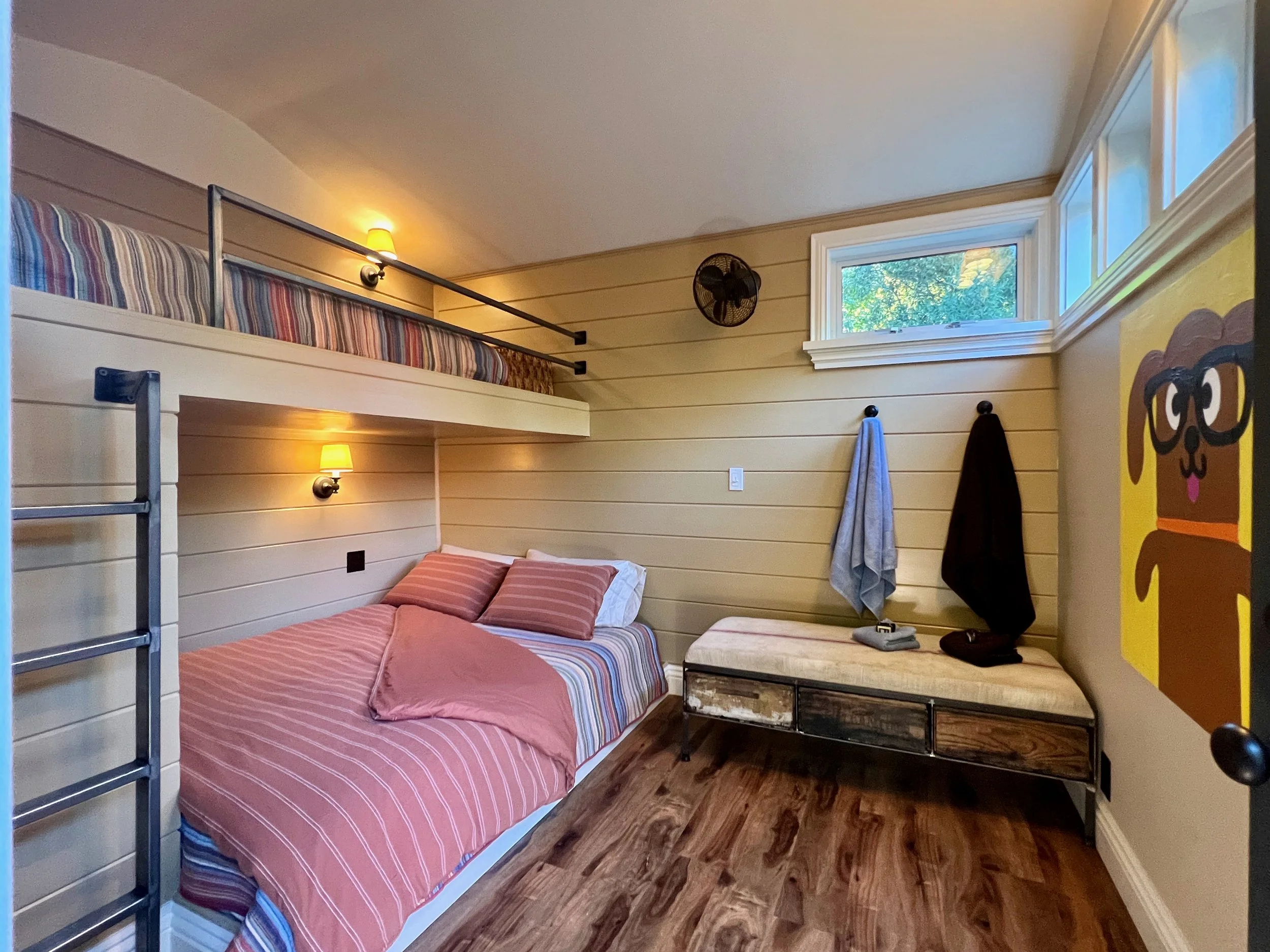 Palm, formerly the potting shed, has been taken to the studs and fully renovated with a custom, built-in, adult bunk bed and a wall fan. It has a cozy feeling — with a slightly lower roofline and small windows placed up high. If you prefer a cozy space, this is for you.