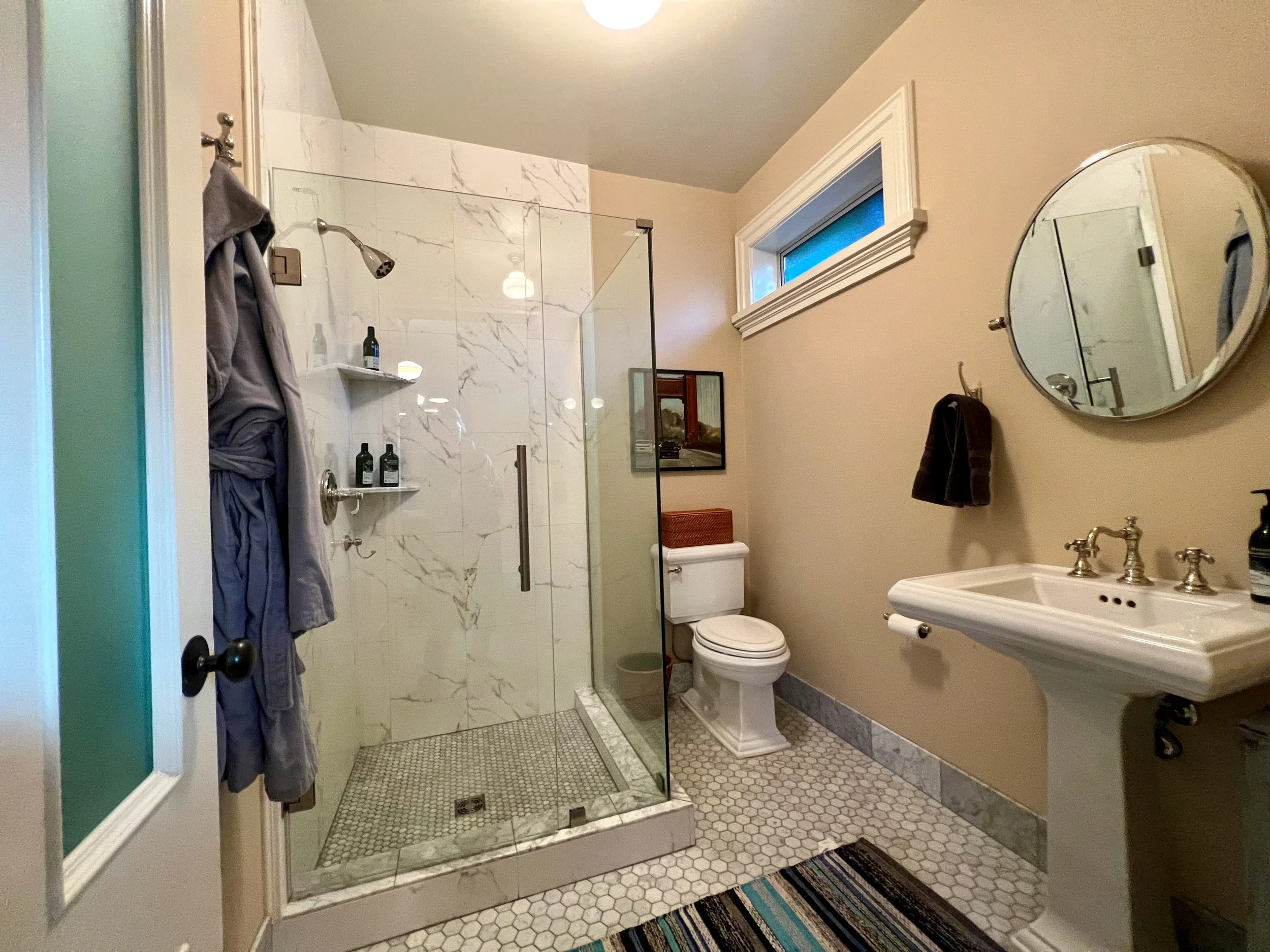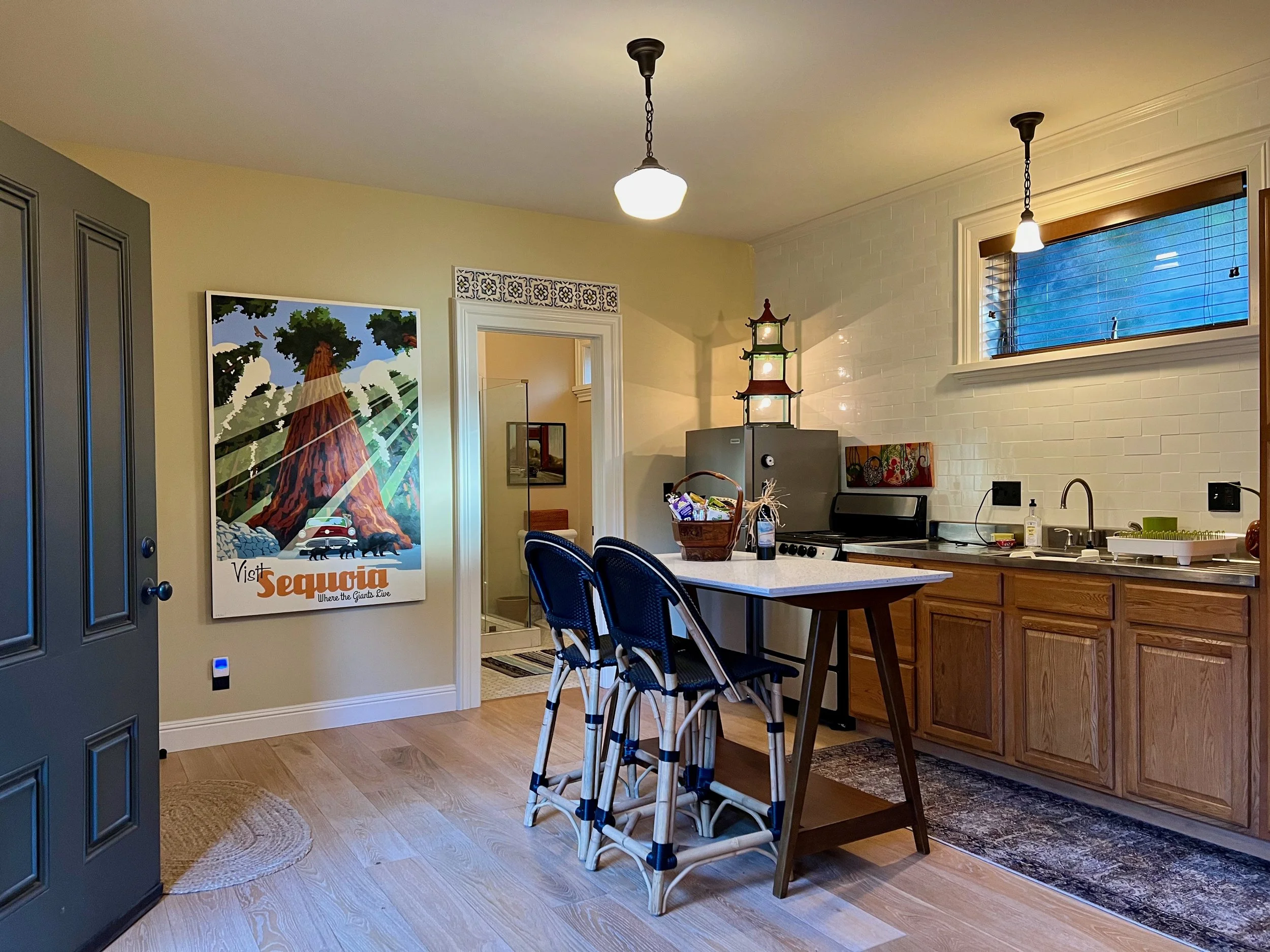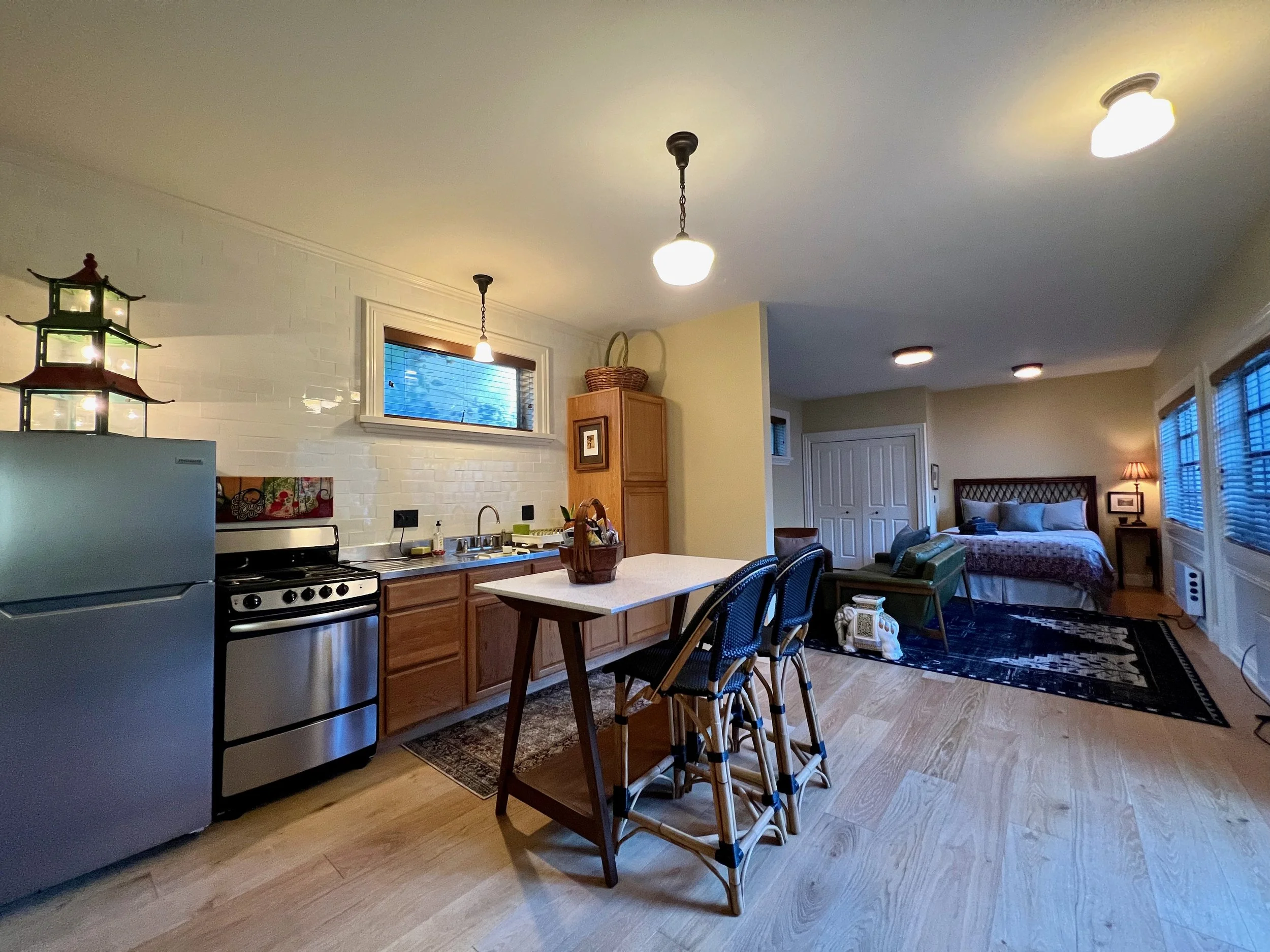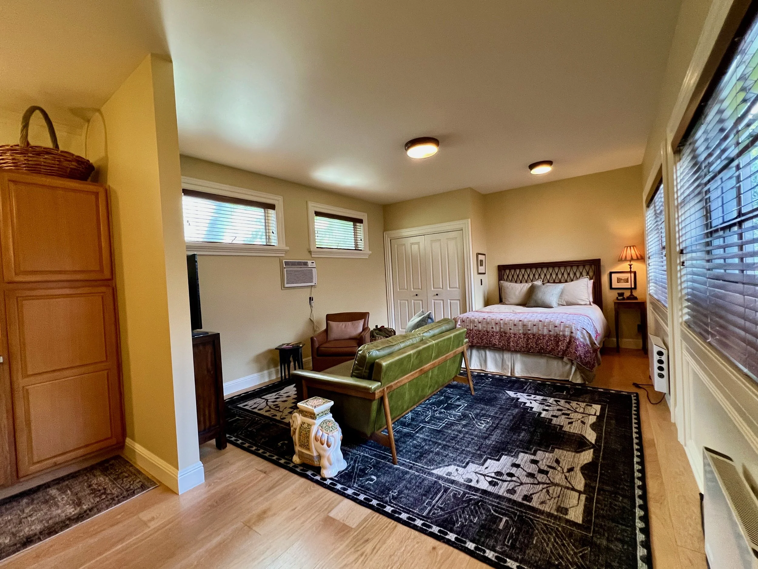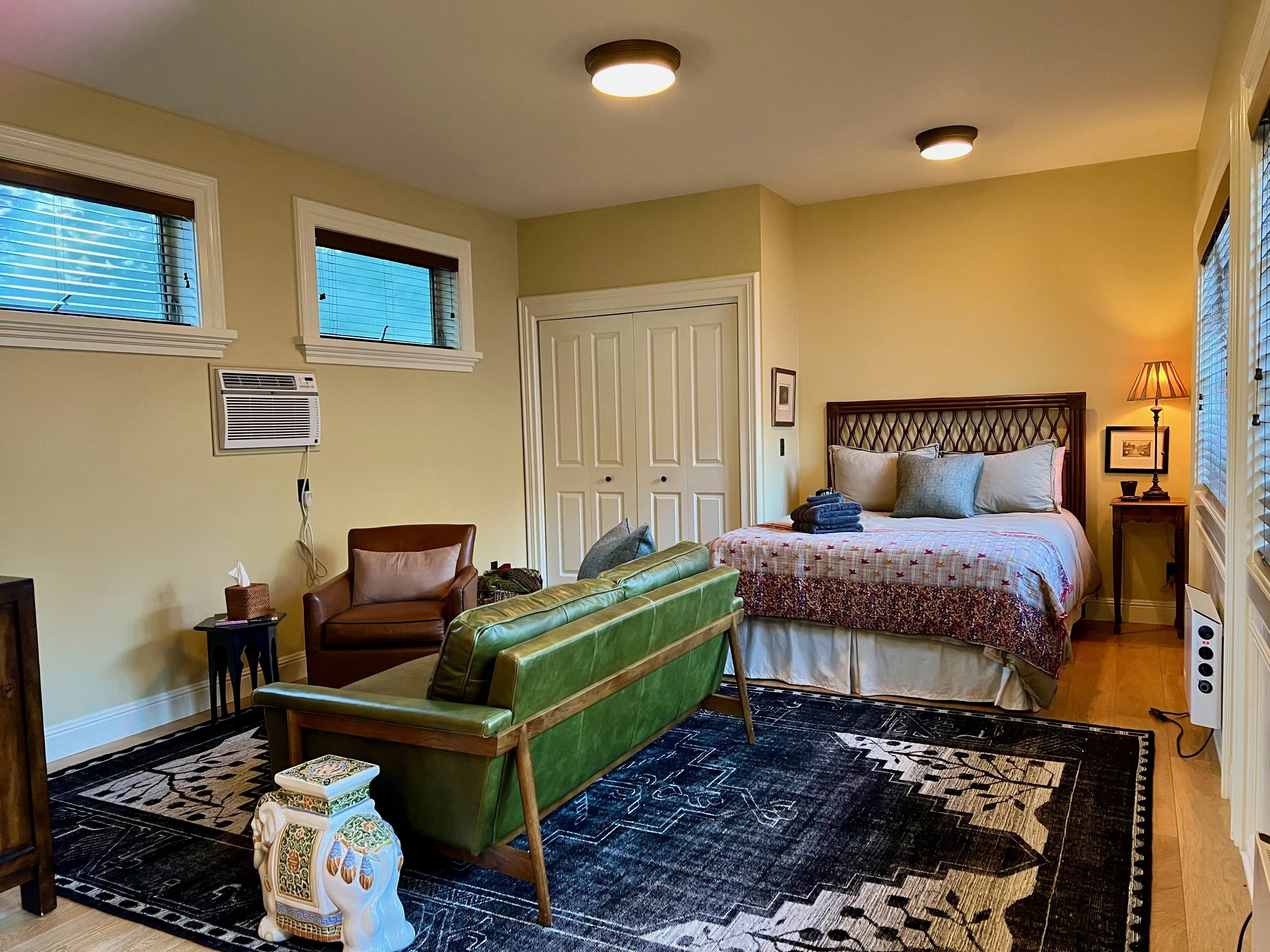 Our 700-square-foot guest cottage, pictured above, has two adjoining spaces that share a wall: Sequoia Studio (475 square feet) and Oak Room (225 square feet). They are connected by a passage door that can be locked (as in a hotel).